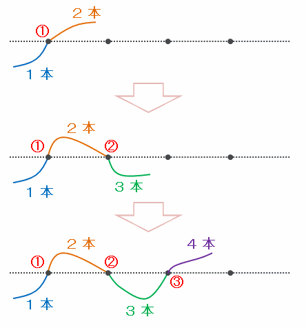 となっているので、点線にそってハサミで切ったときにできる短いひもの本数は「黒丸を通った回数+1」で求められることが分かります。