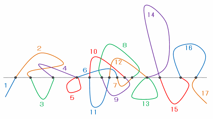 次の図でひもは黒丸を16回通っているので、点線にそってハサミで切ると、短いひもが全部で16+1=17本できます。