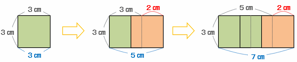 したがって、2枚目からは次の図のように、1枚増やすごとに横幅が3-1=2㎝ずつ増えていきます。