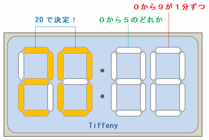 ・青色の部分→「分」の十の位なので、「0」から「5」までのどれかがあてはまる。