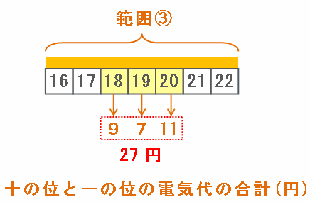 となり、この3つの数の電気代は9+7+11=27円となることが分かります。