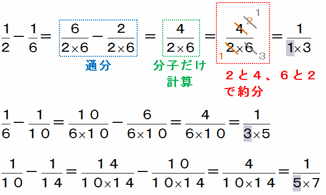 ◆ (b)は(a)のとなり合う分数の差でできる数の列です。