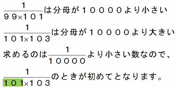2×□-1=101のとき、□は(101+1)÷2=51なので、初めて0.0001より小さくなるのは51番目になります。