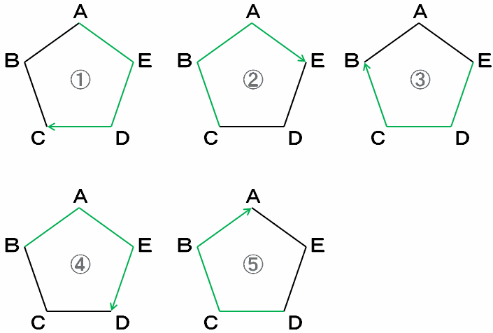 正五角形ABCDEと白玉、黒玉が1個ずつあります。白玉は右回りに、黒玉は左回りに、頂点から頂点へ同じ速さで移動します。1回の移動で3つ先の頂点まで進み、止まります。次の移動からは、直前の移動で止まった場所から進みます。
