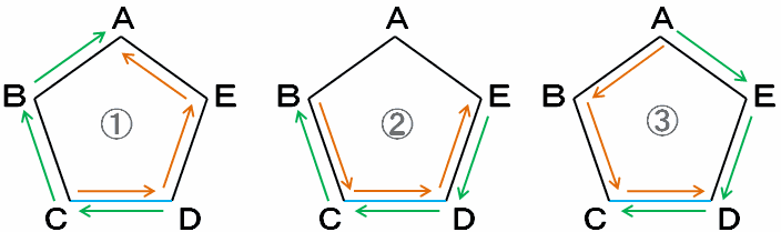 白玉も黒玉もそれぞれ「ワン!ツー!スリー!」という感じで頂点を3個ずつ進んでいくのですが、最後にCとDの真ん中ですれ違ったときが「ワン!」「ツー!」「スリー!」のどれだったのかによって、次の①~③の3つの図に分かれます。
