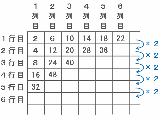 特にそれぞれの列を縦に見てみると、下のマス目の数は上のマス目の数の2倍になっていることが分かります。