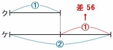 また、ケはクよりも56大きいので、次の線分図の②-①=①めもりが2つの数の差である56にあたります。