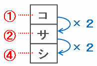 次の図のように、サはコの2倍、そしてシはサの2倍の数なので、コにあてはまる数の大きさを①とおくと、サは①×2=②、シは②×2=④と表すことができます。