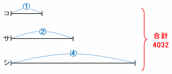 (6) コ、サ、シが次の図のようにならんでいます。コ+サ+シ=4032です。
