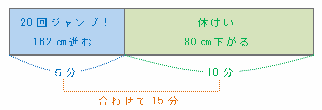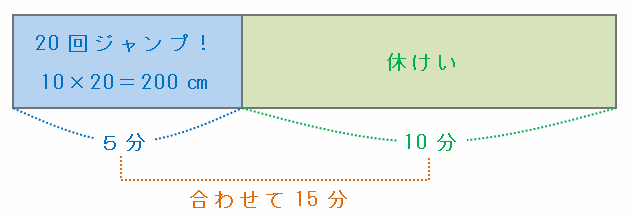 このカエルは「5分間のジャンプで10×20=200㎝進む」と「10分間休憩」をくり返して山を登っていくので、次の図のように5+10=15分間を1セットにして考えます。