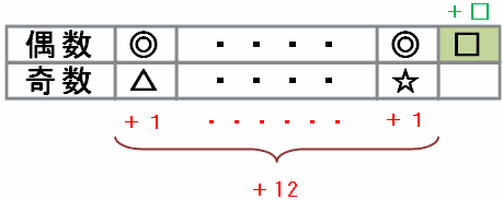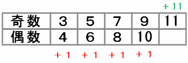 ※ このとき、奇数の最後の数は7+4=11という計算で求められます。