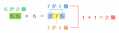 A=55のときは、55×5=275となりますが、次の図のようにいちばん上の位にある2といちばん下の位にある5を足すと、ちょうど7が1個できるので、2+7+5=7×2=14となります。