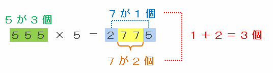 A=555のときは、555×5=2775となりますが、次の図のようにいちばん上の位にある2といちばん下の位にある5を足すと、さっきと同じように7が1個できるので、2+7+7+5=7×3=21となります。