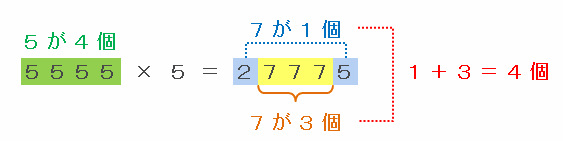 A=5555のときは、5555×5=27775となりますが、次の図のようにいちばん上の位にある2といちばん下の位にある5を足すと、やはり7が1個できるので、2+7+7+7+5=7×4=28となります。