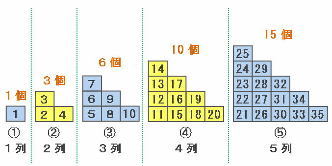1グループ目は1列、2グループ目は2列、3グループ目は3列、・・・のように、□グループ目には数字が縦に□列並んでいます。