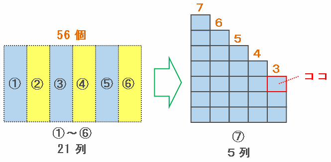 また、6グループ目の最後の数は56なので、そこからさらに7+6+5+4+3=25個進むと、次の図のように7グループ目の5列目にある下から3段目に到着します。