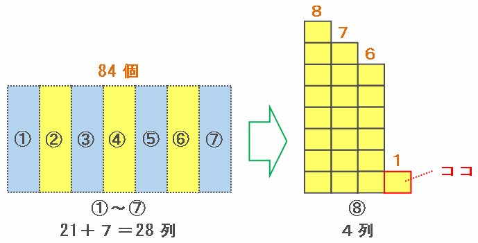 1グループ目から7グループ目までは21+7=28列あるので、8グループ目の4列目は最初から数えて28+4=32列目になります。