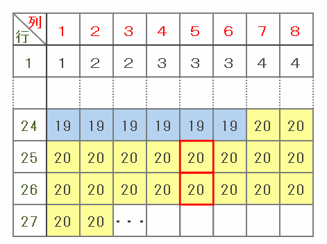つまり次の図のように、24行目の7列目から27行目の2列目までは20が20個連続して並んでいるので、5列目に「20」が来るのは25行目と26行目になります。