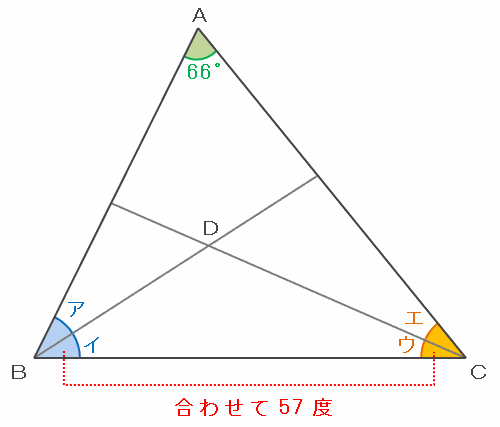 また、アとイ、ウとエの角度はそれぞれ同じなので、「ア+エ」と「イ+ウ」の答えはどちらも114÷2=57度になります。
