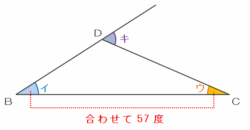 次の図の角キは三角形DBCの外角になっているので、角キの大きさはイとウの角度の合計と同じく57度になります。
