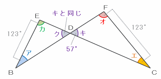 また、角クとキは対頂角の関係で大きさが等しいので、三角形EBDの中にある角アとカの合計も123度になります。