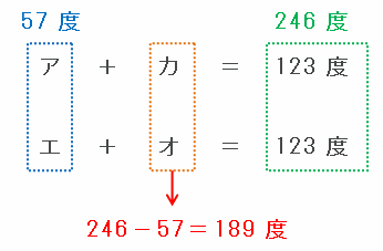 「ア+カ=123度」と「エ+オ=123度」という2つの式を次の図のように並べてみると、アとエの合計は57度、そして123度が2つで246度なので、カとオの合計は246-57=189度となります。