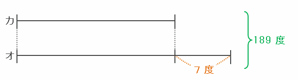 角カとオの合計は189度、そして角オはカよりも7度大きいので、2つの角度の関係は次のような和差算の線分図に表せます。