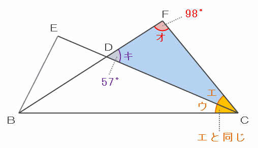 次の図の三角形FDCは、角キが57度、角オが98度なので、角エは180-(57+98)=25度です。