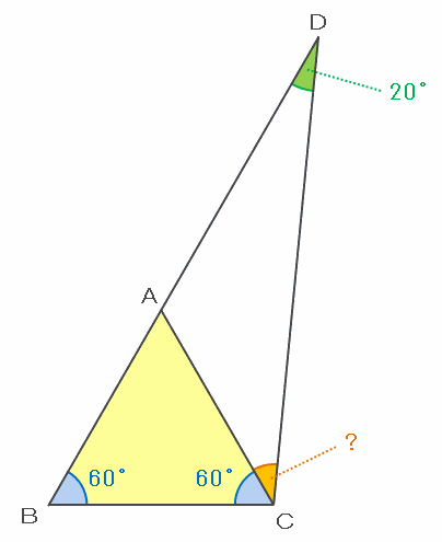 三角形DBCの内角の和は180度なので、図のオレンジ色の角度は180-(20+60+60)=40度になります。