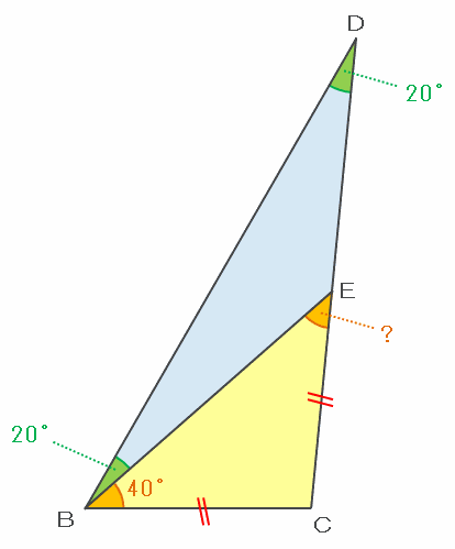 図の角CEBは三角形EDBの外角になっているので、その大きさは20+20=40度です。