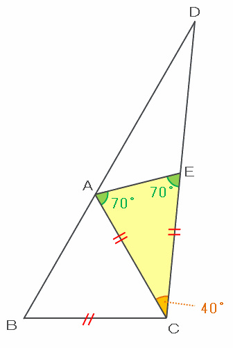 つまり、三角形CAEも二等辺なので、角CAEとCEAはどちらも(180-40)÷2=70度になります。