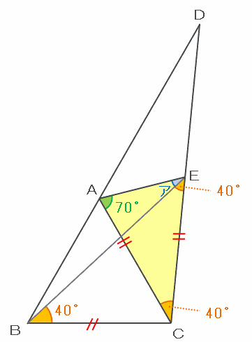 つまり角CEBとCBEはどちらも40度なので、三角形CEBは辺CEとCBの長さが等しい二等辺三角形になります。