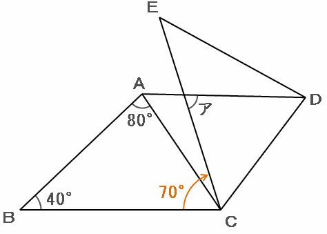 下の図の角ACBは三角形ABCの内角のひとつなので、その大きさは180-(80+40)=60度です。