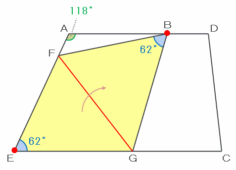 さらに、下の図を赤い辺FGで折り曲げると三角形EFGがBFGにピッタリ重なるので、角FBGの大きさもFEGと同じく62度であることが分かります。