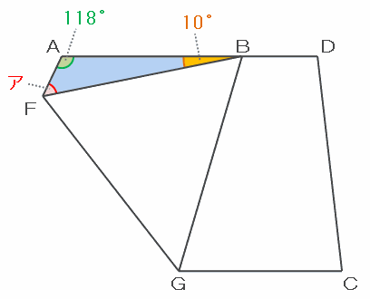 つまり次の図のように、三角形AFBの角FABは118度、ABFは10度なので、角アの大きさは180-(118+10)=52度になります。