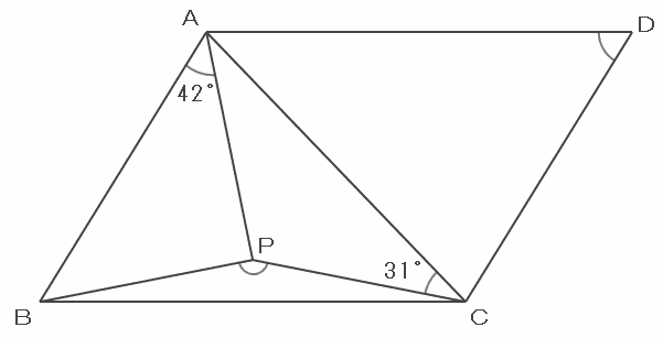 次の図のように、角BAP=42度、角ACP=31度、AP=BP=CPとなる平行四辺形ABCDがあります。このとき、次の角の大きさを求めなさい。