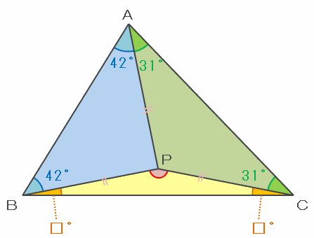 したがって、角ABPの大きさはBAPと同じく42度、そして角CAPの大きさはACPと同じく31度です。
