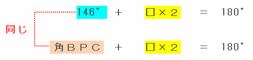 その2つの式を次の図のように並べて比べてみると、どちらも合計が同じで「□×2」の部分も共通なので、上の式の「146度」と下の式の「角BPC」は等しいことが分かります。