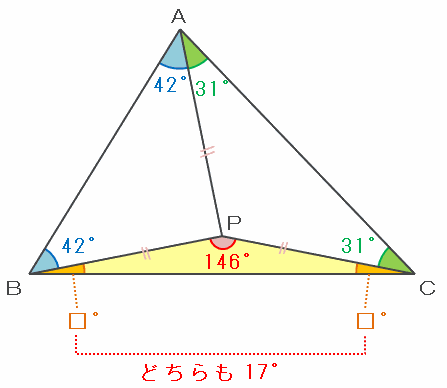 さっきの問題で角BPCの大きさは146度であることが分かったので、次の図の二等辺三角形PBCの角PBCとPCBの大きさは、どちらも(180-146)÷2=17度になります。
