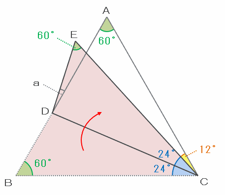 したがって、角BCDはECDと同じく24度、そして角CEDはCBDと同じく60度です。