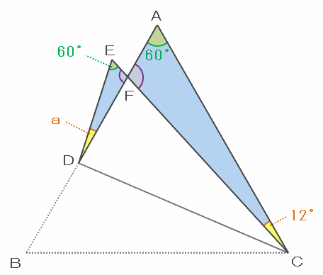 以上から、角aの大きさは角ACFと同じく12度になります。