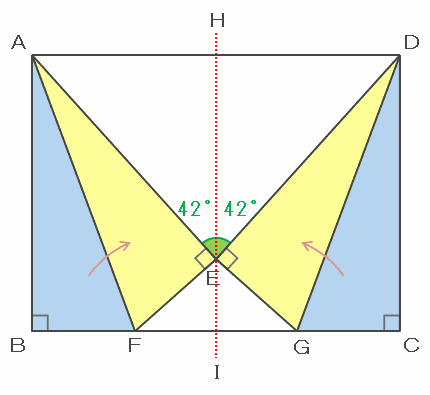 つまり、角AEDの大きさは84度で、それが赤い線によって2等分されているので、角AEHと角DEHはどちらも84÷2=42度です。