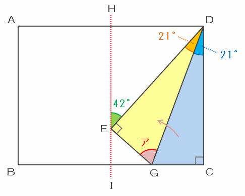 上の図の角EDCの大きさは42度で、それが辺DGによって2等分されているので、角EDGとCDGの大きさはどちらも42÷2=21度です。