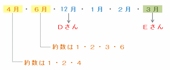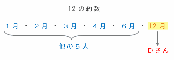 Dさんの生まれた月を他の5人の倍数にするためには、次の図のようにDさんの生まれた月が約数を6個持つ数であればOKです。