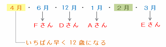 いちばん最後に12歳になるのはEさんなので、3月生まれはEさんになります。