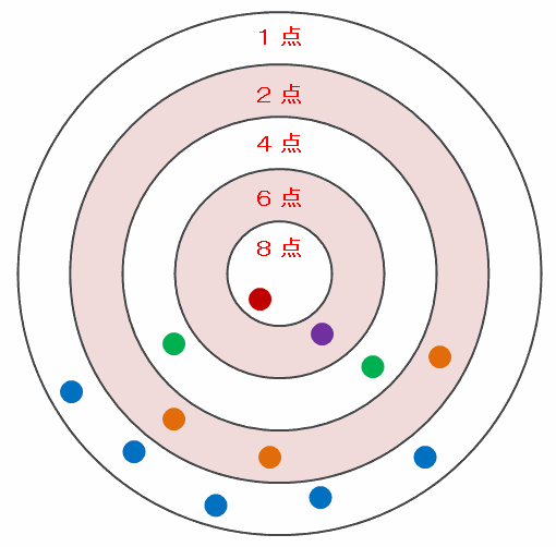 まずは次の図を利用して、それぞれの点数の枠にボールが何回当たったのかを確認してみると、