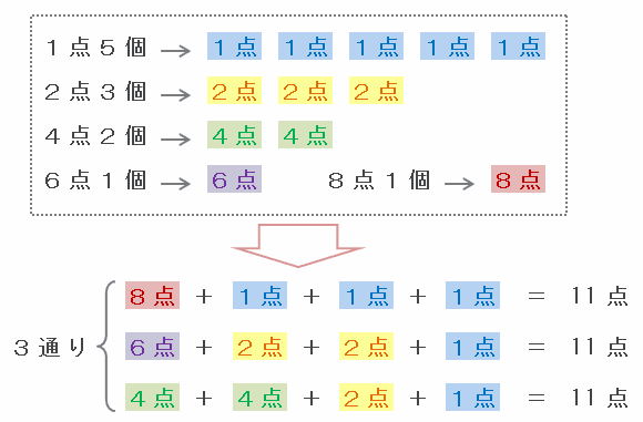 ・6点に当てた人→11-6=5点なので、残りの3回は「2点・2点・1点」だった。