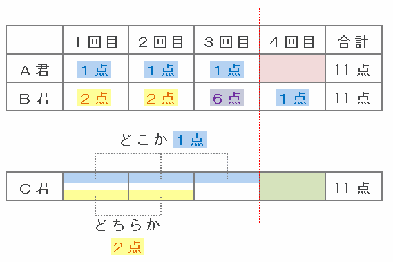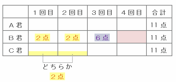 また、B君は4点の枠に1回も当たらなかったので、4回の得点の組み合わせは「6点・2点・2点・1点」でした。