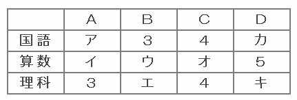 次の表はAさん、Bさん、Cさん、Dさん4人の国語、算数、理科の5段階(1から5まで)の成績表です。①から⑧までの条件があるとき、表のアからキの部分に入る数字を答えなさい。