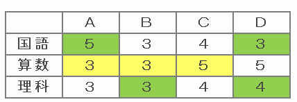 ⑤→Dの成績は「3・4・5」が1つずつなので、カとキは3または4